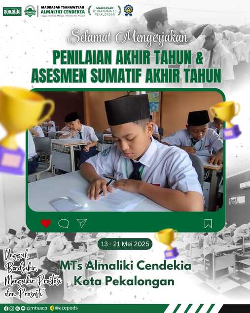 Pekalongan, 13 Mei 2025 — Suasana kompetitif dan semangat yang tinggi semakin terasa di MTs Almaliki Cendekia Kota Pekalongan menjelang dilaksanakannya Penilaian Akhir Tahun (PAT) bagi siswa dan siswi, yang akan berlangsung dari 13 hingga 21 Mei 2025. Kegiatan PAT ini menjadi momen penting bagi para siswa untuk menunjukkan performa terbaik mereka dan meraih peringkat tertinggi di akhir tahun pembelajaran 2024/2025.